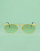 La monture adopte une forme aviator adoucie, avec des verres arrondis qui apportent une silhouette équilibrée et intemporelle. La barre supérieure droite, associée à un double pont délicat, structure le regard tout en conservant une grande finesse visuelle.